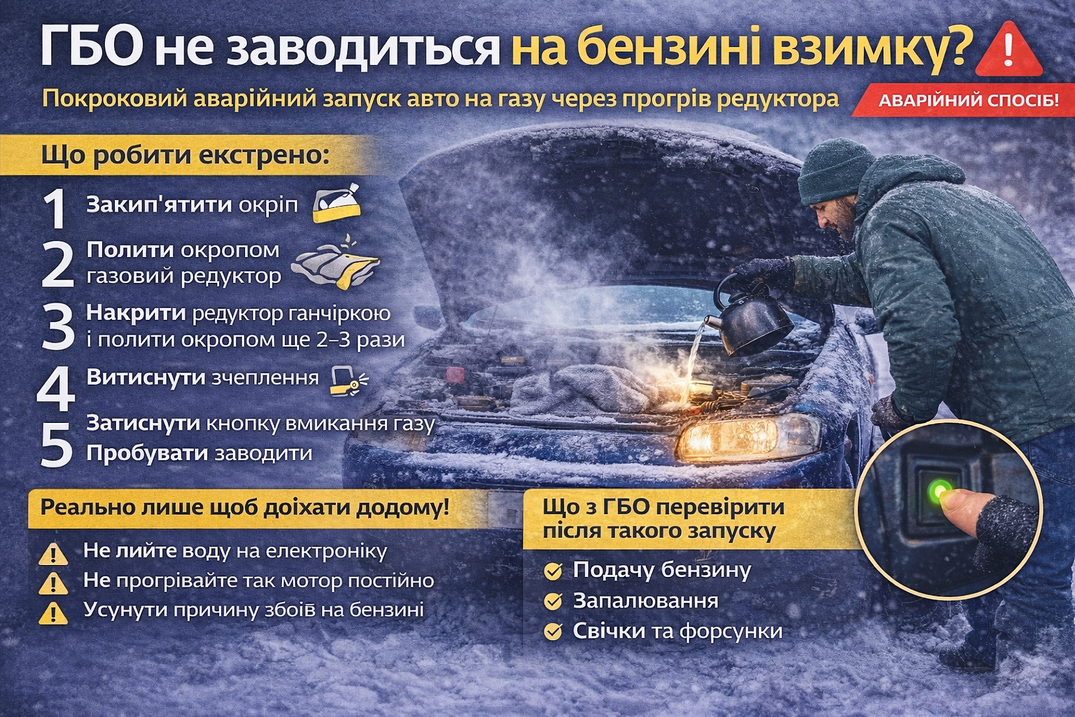 У мороз газ гірше випаровується, а холодний редуктор не дає стабільної суміші. Прогрів редуктора окропом тимчасово допомагає системі працювати нормально і дає шанс запустити двигун, щоб доїхати до безпечного місця.