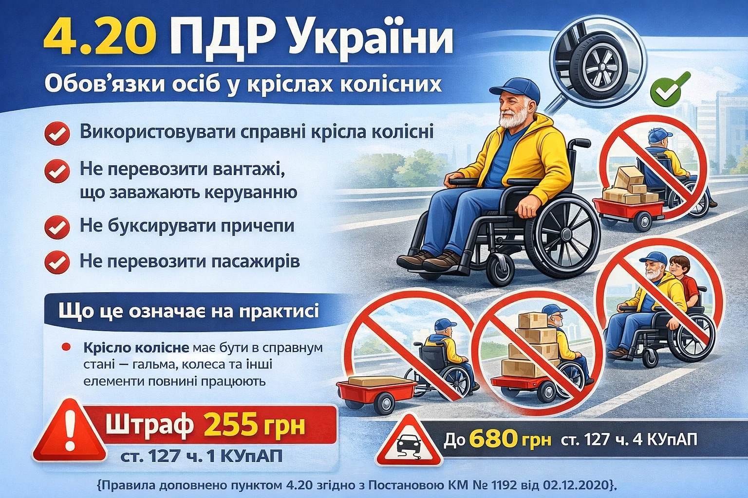 Пункт 4.20 ПДР України встановлює чіткі вимоги до безпечного використання крісел колісних. Дотримання цих правил — це не формальність, а необхідна умова безпеки на дорозі.